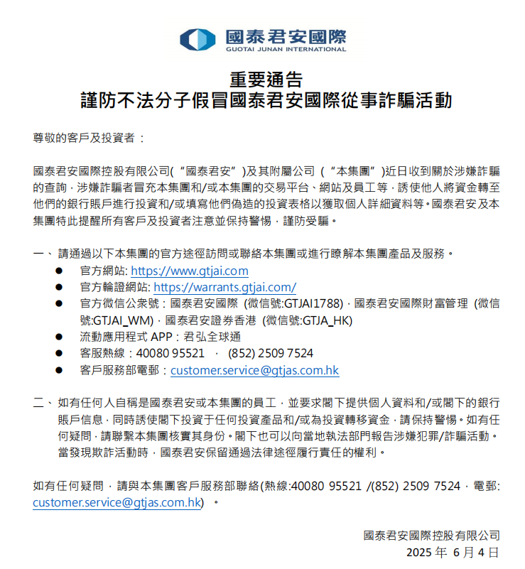 国泰君安证券股份有限公司及其全资子公司,官网域名统一为gtja.(后缀自加,平台不允许宣传外站),所以投资前务必通过证监会官网核查备案信息。