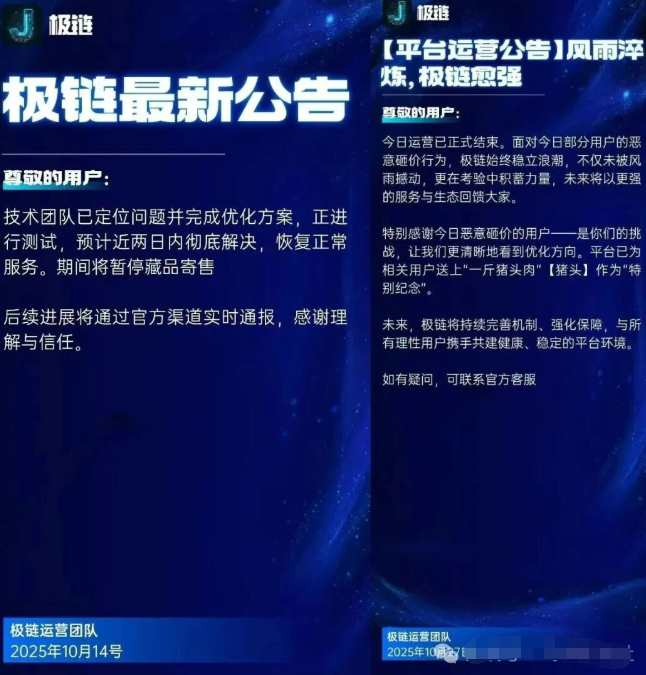 8月10日上线,慢涨模式,10月14日崩盘,10月27日一条公告送给玩家一斤猪头肉藏品做纪念,也是没有谁了,投资者泪水又打湿了猪脚饭