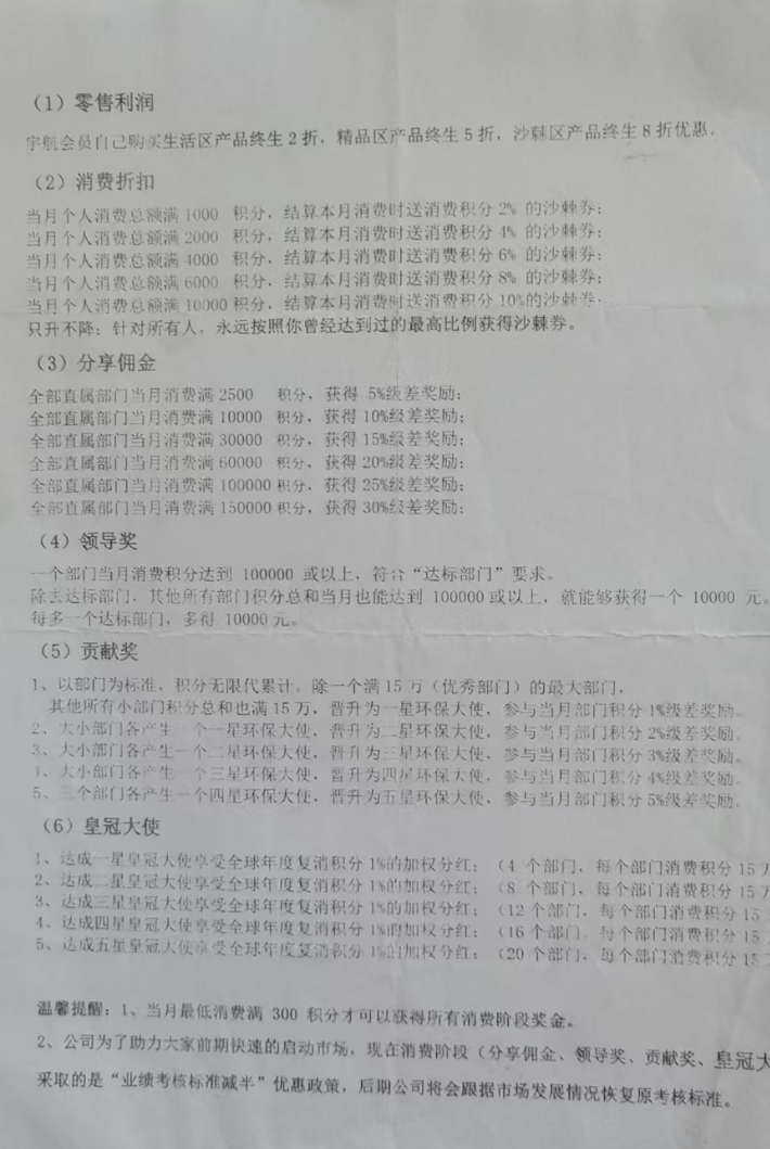 首先小诺找到了“宇航人”的一个代理商,向其了解了关于“宇航人”公司和产品销售推广模式的一些详细情况。公司情况基本也都是网上说的那些套话,没有什么新鲜的。但是对于推广模式,小诺很负责的说就是传统的“太阳线”和“AB双轨制”销售模式。这位代理商给小诺发来“宇航人”销售模式的文字版本,类似于“无限代”,“级差奖励”、“全球分红”这种传销常见词汇赫然在目。所以官媒报道的“宇航人”涉传问题一点都没有冤枉他。