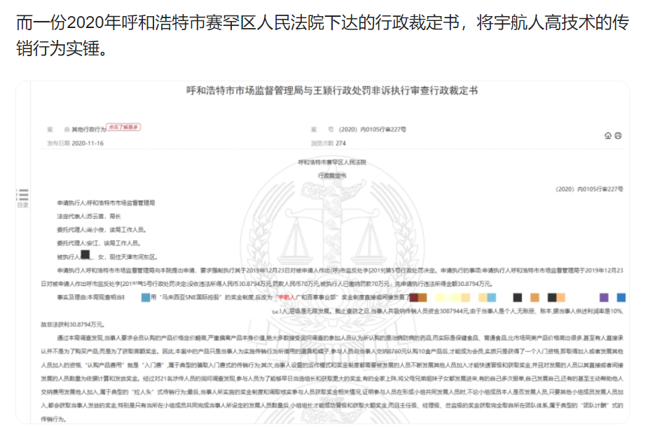 通过官媒发布的一些消息,我们可以看到“宇航人”在2024年向证监会提出了IPO申请,但是因为有关部门检测出其产品铅浓度超标,以及销售模式涉传,直接导致了IPO失败。这两个突发状况均遭到相关部门的处罚。根据这个情况,想必再想通过“宇航人”主体公司实现IPO,是不大可能的事了。其实上市跟底层的参与者并没有太大的实际关系,而公司的产品质量问题,销售模式问题才是参与者应该关心的事情。下面根据“宇航人”涉传的情况,小诺为大家详细解析一下。