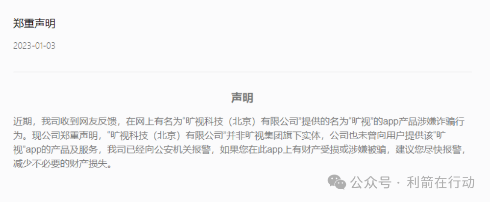2023年1月3日北京旷视科技有限公司发出声明,声明中指出:近期,我司收到网友反馈,在网上有名为“旷视科技(北京)有限公司”提供的名为“旷视”的app产品涉嫌诈骗行为。现公司郑重声明,“旷视科技(北京)有限公司"并非旷视集团旗下实体…………