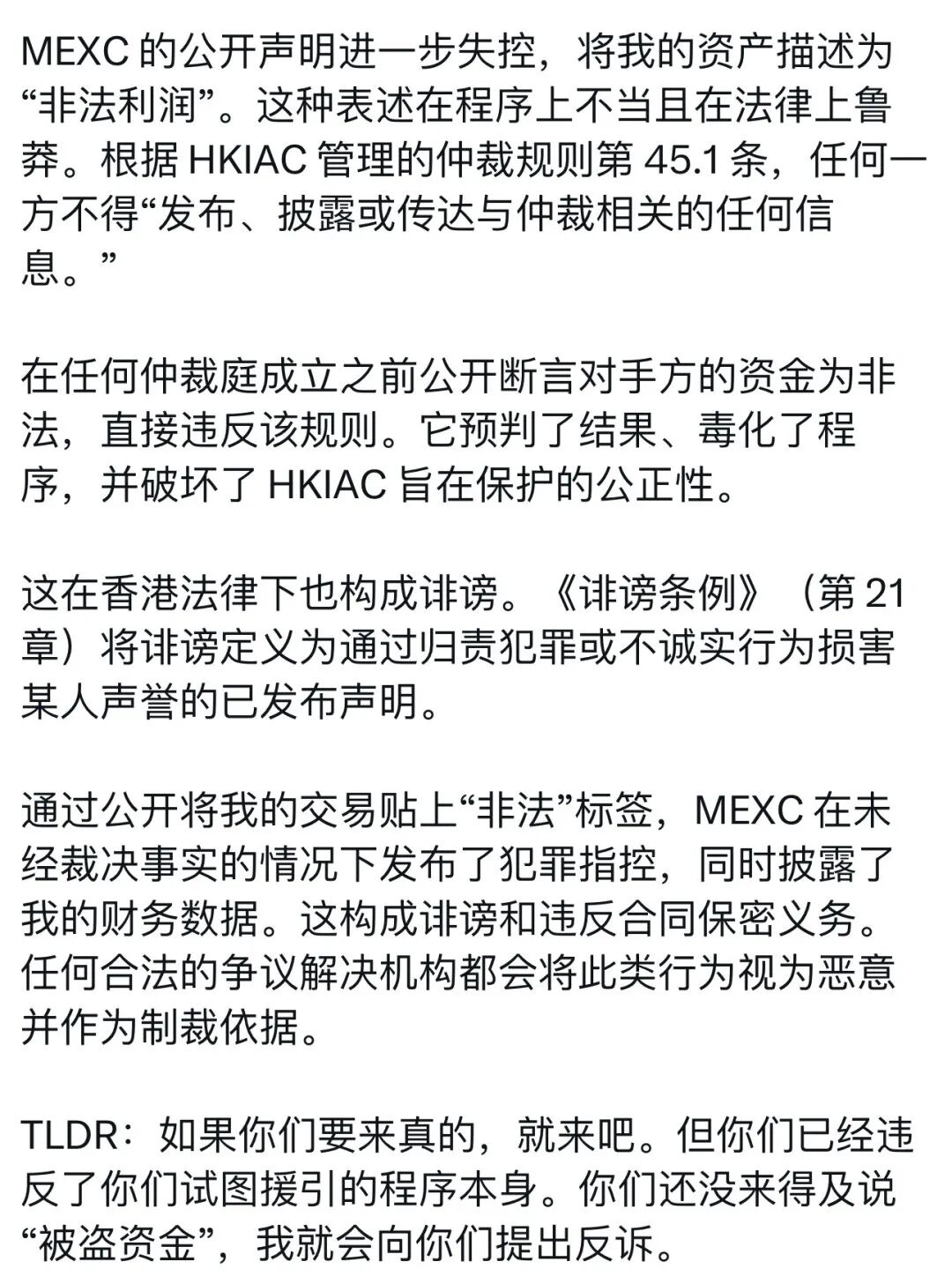 面对汹涌的舆论,抹茶交易所最初的回应是试图“硬刚”,指称该用户涉及“非法交易”,并同样打算将其资金用于“回馈社区”。