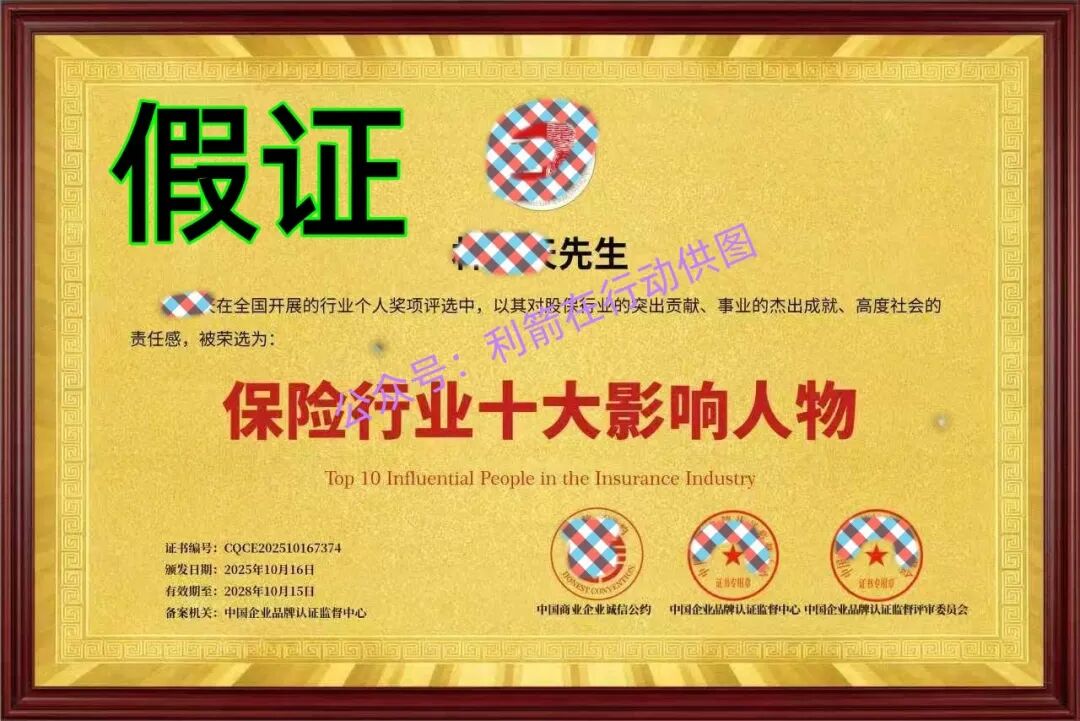 下面这个“保险行业十大影响人物”的牌匾是假的,2025年“保险行业十大影响人物”的评选?现在还是2025年11月份,哪有2025年“保险行业十大影响人物”的评选?即使要评选,也要在2025年结束以后,至少要到2026年1月份开始评选,最快也要到到2026年2月份才能公布,因此这个时间点是不对的!香港的保险公司会在全国范围内评选,这些发证的单位是山寨机构,这里点到为止,这是假证!