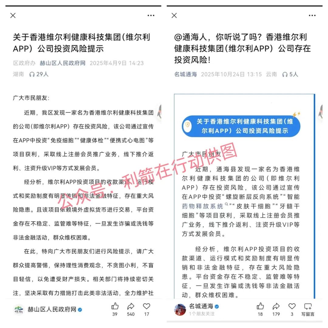利箭在行动已经多次发文提醒参与者香港维尔利APP是资金盘,操盘手通过参与者用人民币购买虚拟币充值进去,再把虚拟币转走“洗白”,里面的理财产品只是骗钱的道具,投资金额由小到大,时间越拉越长,收益越来越高的特点看出,这是诈骗洗钱的杀猪盘,官方有预警,赶紧远离。