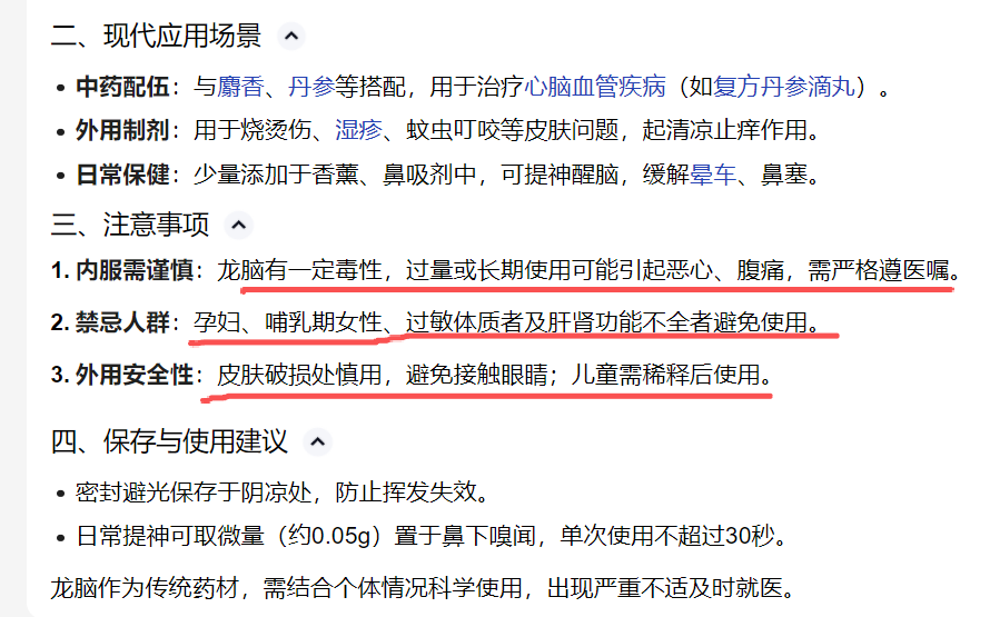 请看下面截图,这是百度对“龙脑”的描述。龙脑又称天然冰片,是从龙脑香树等植物中提取的天然结晶物质,具有醒脑、消热消肿、止痛等功效,广泛用于中药和日常保健领域。核心功效分为四种:开窍星神、清热止痛、抗菌消炎、促进透皮吸收(配合其他治疗类药品外用可配合吸收)。