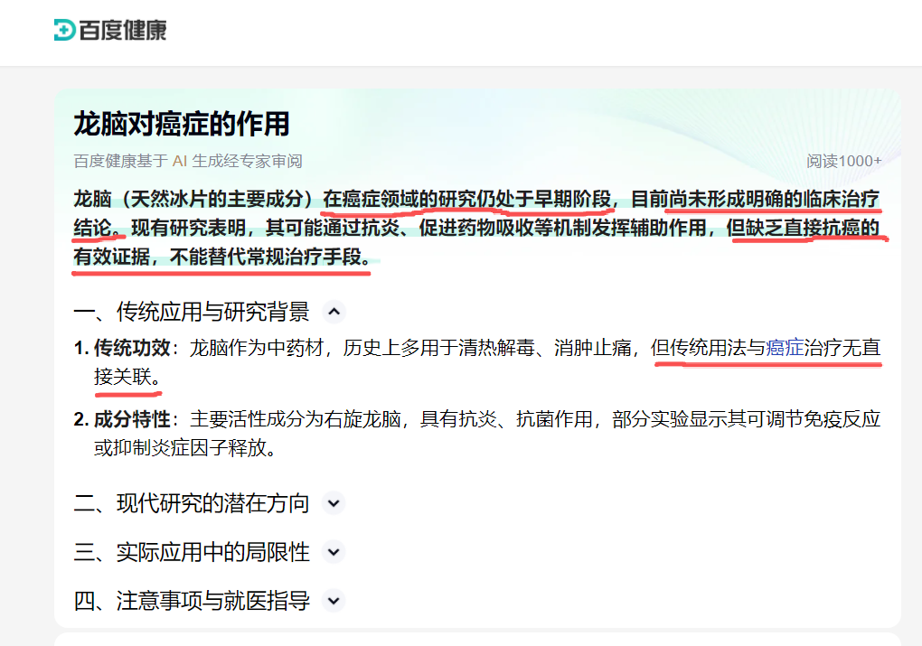 可以看出龙脑这种物质确实有诸多好处,但是总体来看它没有像德懋公司宣传的那样,可以治疗那么多种疾病。其他的就不说了,就单说这介绍资料里说龙脑对肺癌、乳腺癌、口腔癌有较好的凋亡癌细胞的作用。大家仔细看看百度上对龙脑的权威解释,有提到能治疗癌症吗?有提到可以杀死癌细胞吗?它只是一个消炎止痛的功效,配合其他药品制成药膏,可以辅助吸收。就这么点功效,就被宣传可以治疗三十四种病!这明显是夸大宣传,欺骗老年人。
