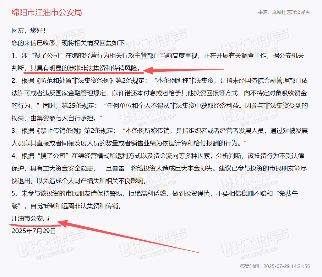 搜了宝是从2021年下半年开始正式推广的,到目前提现困难为止已经运行4年了。之前类似的盘子永倍达从2020年推广,2023年爆雷,一共运行3年。永倍达的情况小诺是十分了解的,就是因为这个盘子宣传的过于高调,很明显的传销模式,肯定会被相关部门盯上的。结果后院起火,永倍达不去灭火反而去浇油,那不烧死自己才怪!今天的搜了宝平台大概率不是这种情况,应该是资金确实出现了问题,兑付困难了。这属于资金盘的正常现象,无论你是高返利还是低返利,平台运行一段时间后,该加入的早就加入了,不想加入的你怎么宣传也不会加入。这就进入了资金流量的衰减期。再加之相关负面报道,更加影响了项目的推广。这是必然要发生的情况。比如四川绵阳相关部门发出了风险警示,这是政府层面的公示,具备绝对的权威和公信力,老百姓看了还能去参与吗?项目的资金池不衰减才怪!
