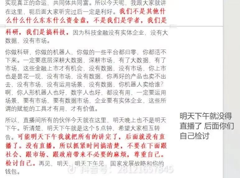 下面再来看看搜了宝的创始人在11月5号直播时对会员说的话。下面是网友转换成文字曝光出来的。首先人家根本就否认会员是投资给了搜了宝公司,而是转给了批发经销商,搜了宝只是一个居间方。把自己的责任全部撇清了。人家政府的职能部门都发出公告说搜了宝涉嫌非法集资,涉嫌传销了,然后创始人直播还在推卸责任。传销和非法集资都成了会员的责任。还让会员不要关心提现问题,要关系自己是否存在违规,违法行为,然后去自首。简直搞笑,人家来了就是为了赚钱的,你提供的模式就存在问题,这时候出事了,你开始推卸责任了。还敢说发企业负面的都是黑嘴,那我请问搜了宝,绵阳发布的你涉传的公告也是黑嘴吗?我看你要翻天啊!