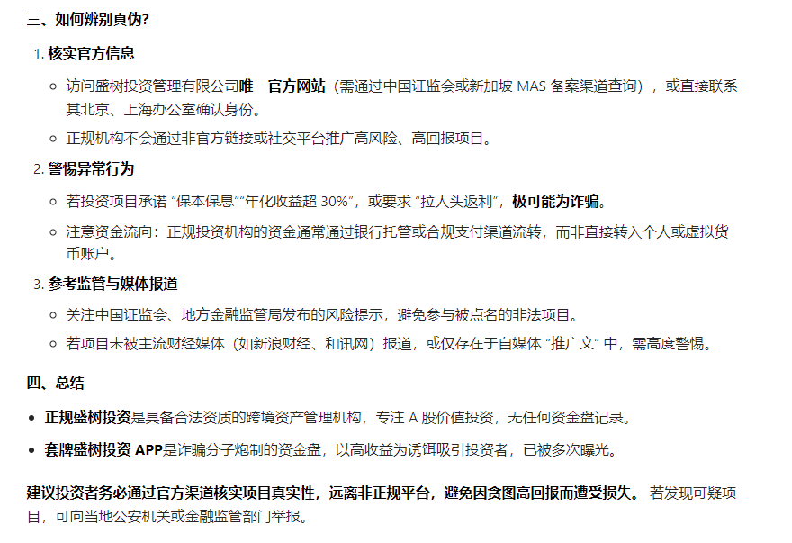 综上所述,通过两个AI的辨别,可以知晓,盛树投资就是一个套牌的资金盘骗局。千万要远离。不要参与。