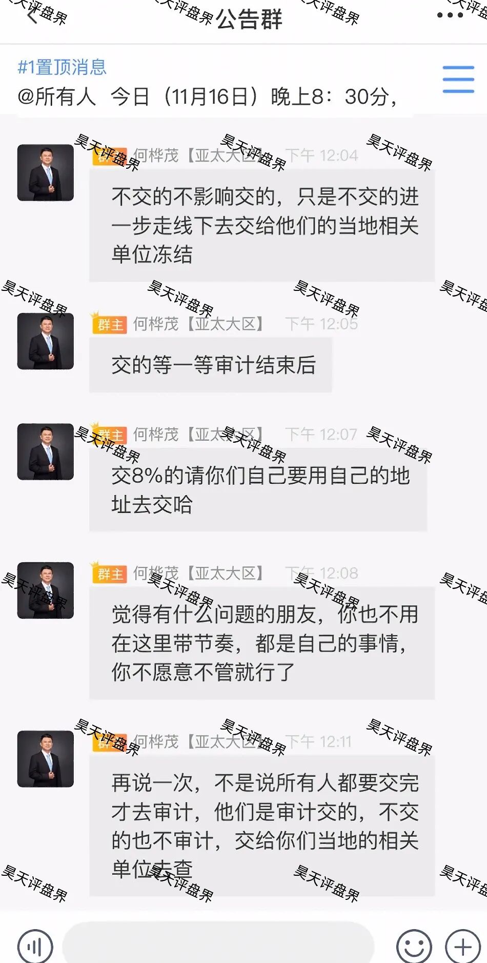 股票带单类资金盘骗局,会员10万多,操盘手圈钱十几亿,昊天多次发布预警和爆料,昨日上午发布公告已经崩盘,不能提现了,要求会员继续充值本金的8%“审计费”才能提现,典型的二次收割老套路了,目前诈骗团伙又开了个新盘,下一步就是平移新盘继续割韭菜了,切勿在此上当受骗,受害者速度报警维权吧,后面昊天会持续关注!