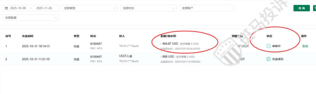 然后我2025年十一月出金两笔,第一笔出金888美金到账了,但是后面一笔出金466.8美金迟迟未办理,未到账,多次联系平台客服也没有回应,希望平台能够给其尽快出金到账。