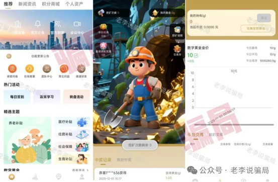 假借“发放500-600万资助款”吸引实名注册,套取个人信息后上架“数字黄金”“补贴”等虚假项目,诱导拉新“挖矿”。每日签到奖励实为无法提现的数字游戏,提现即被收割。