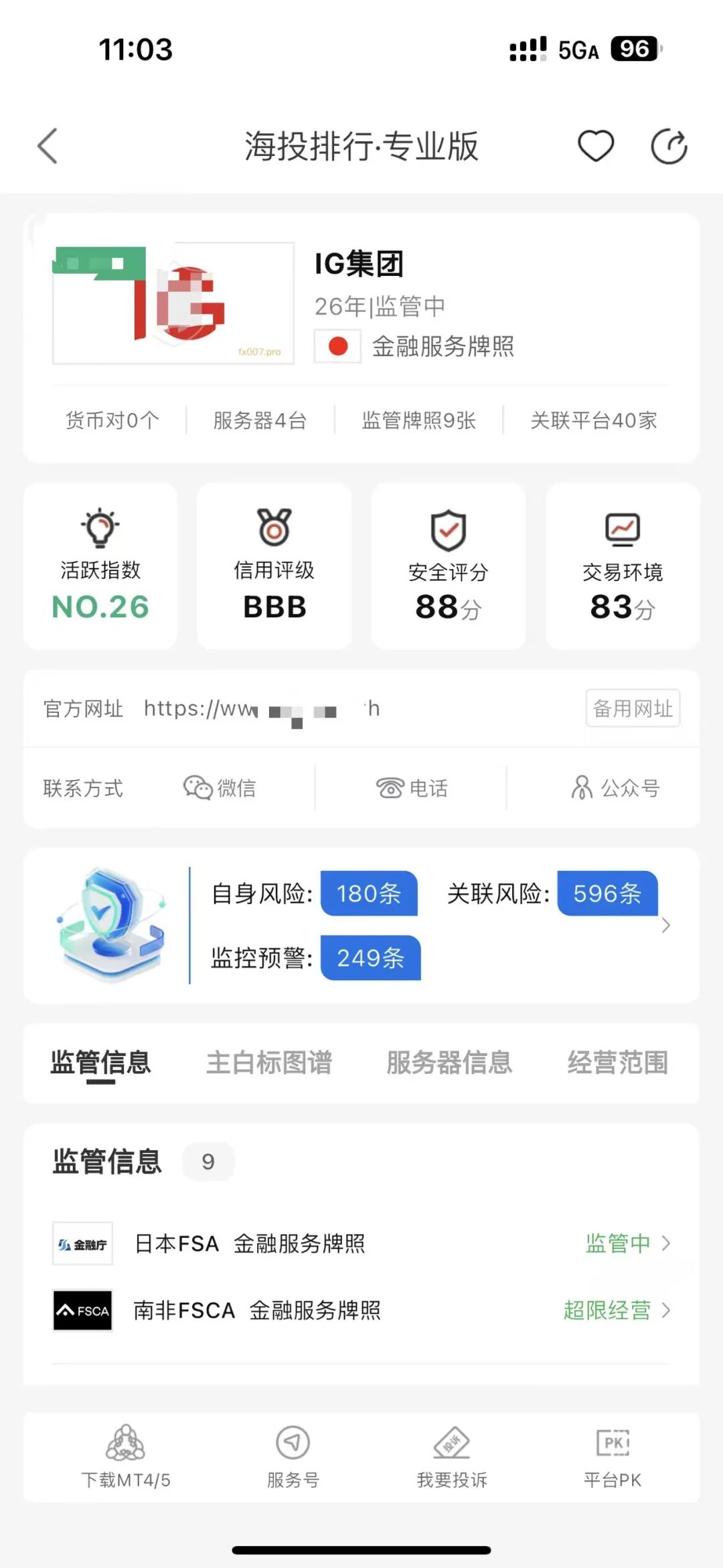 根据第三方外汇平台安全性查询软件海投的数据显示,IG平台排名26,成立26年,该平台持有9个相关金融监管牌照,但具体情况需要进一步核实。(这一评分仅供参考,投资者在选择平台时应综合考虑多种因素。)