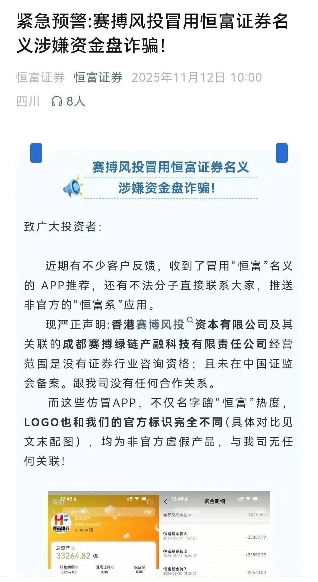 当 “45 天回本”“日息最高 10%” 的投资承诺摆在面前,你是否会心动?近期,名为 “赛搏风投”(冒用 “恒富证券” 名义)的股票带单类资金盘骗局正式崩盘,数亿资金被套,超 7 万名投资者从 “暴富梦” 跌入 “维权难” 的现实深渊,这场精心设计的骗局,再次给所有投资者敲响了警钟。