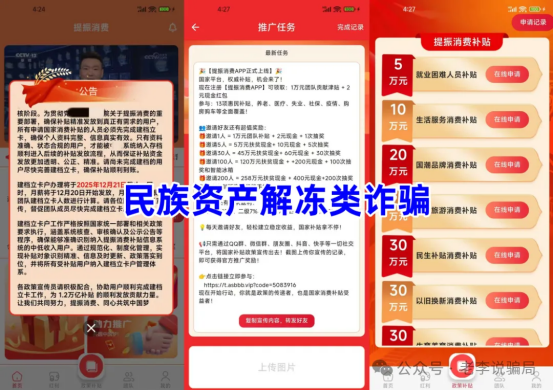 近年来,各类虚假投资理财、民族资产解冻类诈骗项目层出不穷,多以“国家政策”“官方机构”或知名企业名义进行包装,通过高额返利、发放补贴、免费领奖等话术诱骗公众参与。