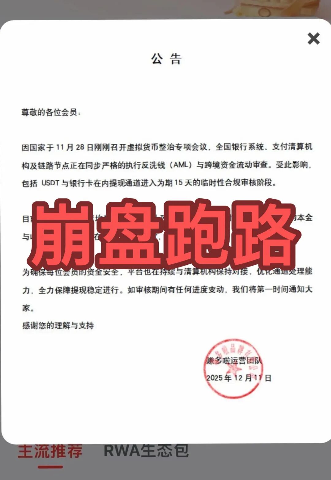 赚多啦,分红模式资金盘,昨天平台发布公告,因为受到一些影响,现在平台提现通道进入15天审核阶段,什么意思呢?意思就是骗子又随便找个借口,你就提不了现了,小编说过很多次,资金盘提现出问题,必跑,所以这个叫赚多啦的资金盘,也是宣布崩盘跑路。