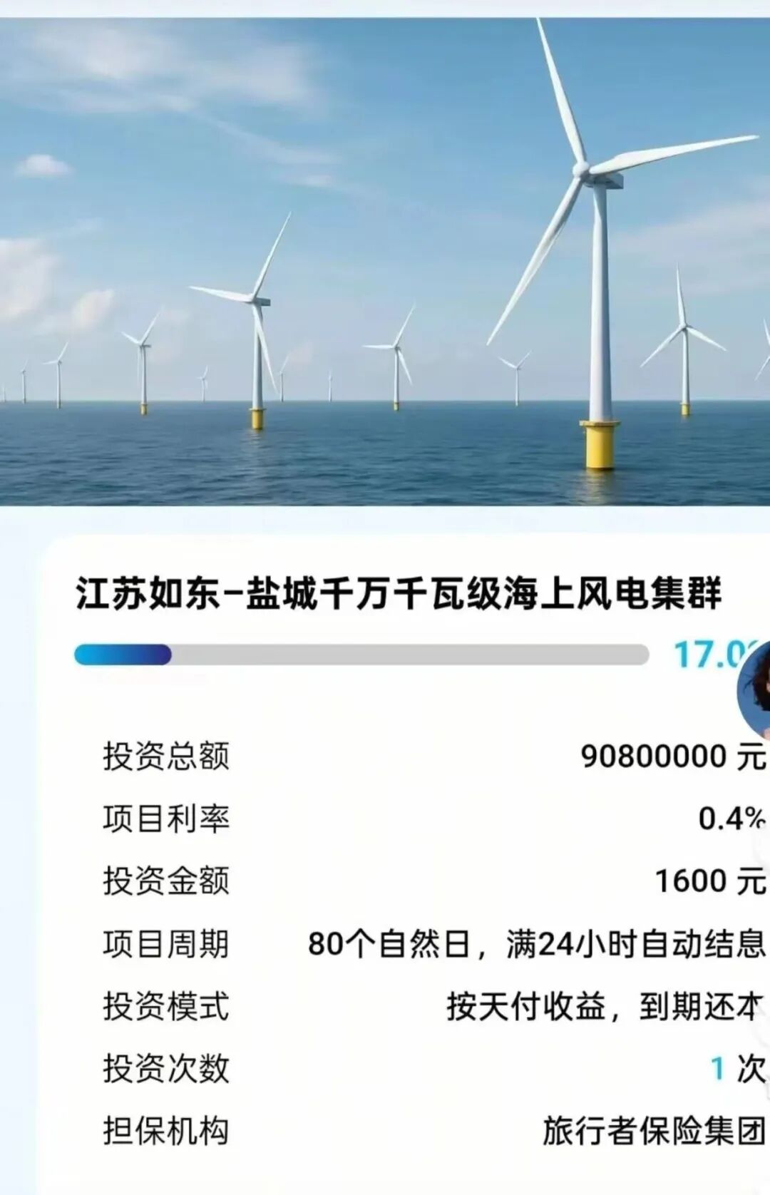 再看看这个所谓的投资利率:江苏如东、盐城的千万千瓦级海上风电集群项目,宣称需要融资 9800 万,给出日利润 0.4%、月化利润 12% 的超高回报 —— 这样离谱的高收益,真能轮得到普通投资者分一杯羹?说白了,区区 9800 万,盐城本地的有钱人随便一位都能轻松拿出,哪里需要挨家挨户拉着普通人一点点集资?核心真相很简单:项目方骗不来某一个人的 9800 万,却能靠着画大饼,骗走一群人的 1600 块!