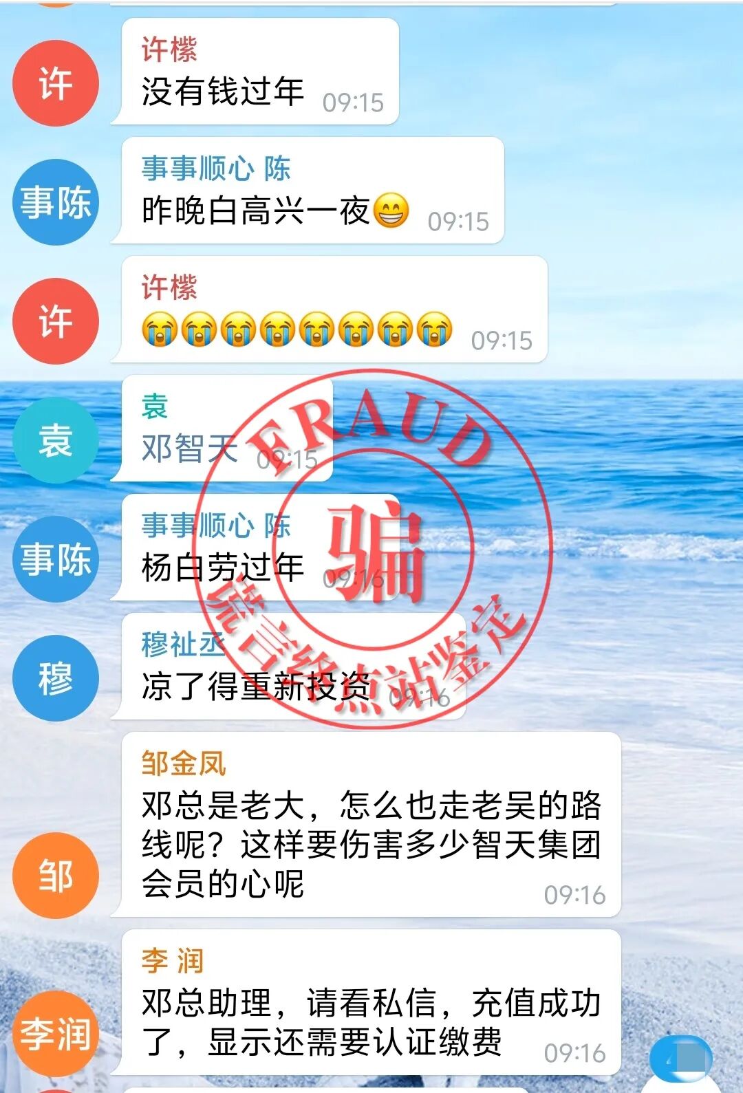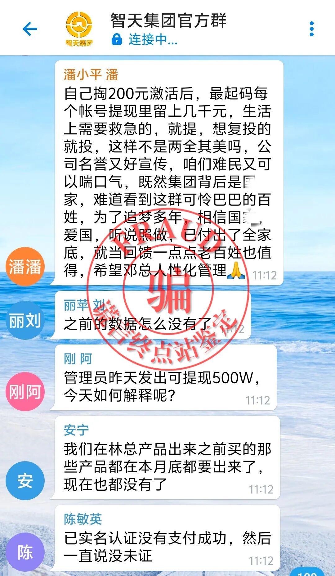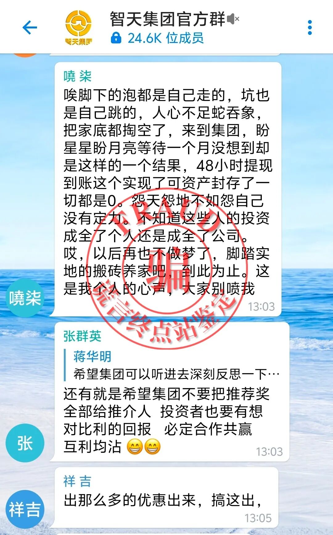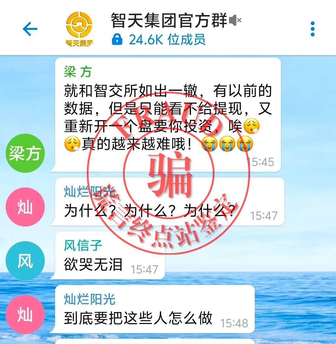 2025年11月15日,在一轮又一轮的超高收益、超短期产品的疯狂推销后,天家人们看着后台数字暴涨,等着发财之际,智天集团突然停止提现!来了一出关门打狗的好戏!这完全应验了谎言终点站的预测!