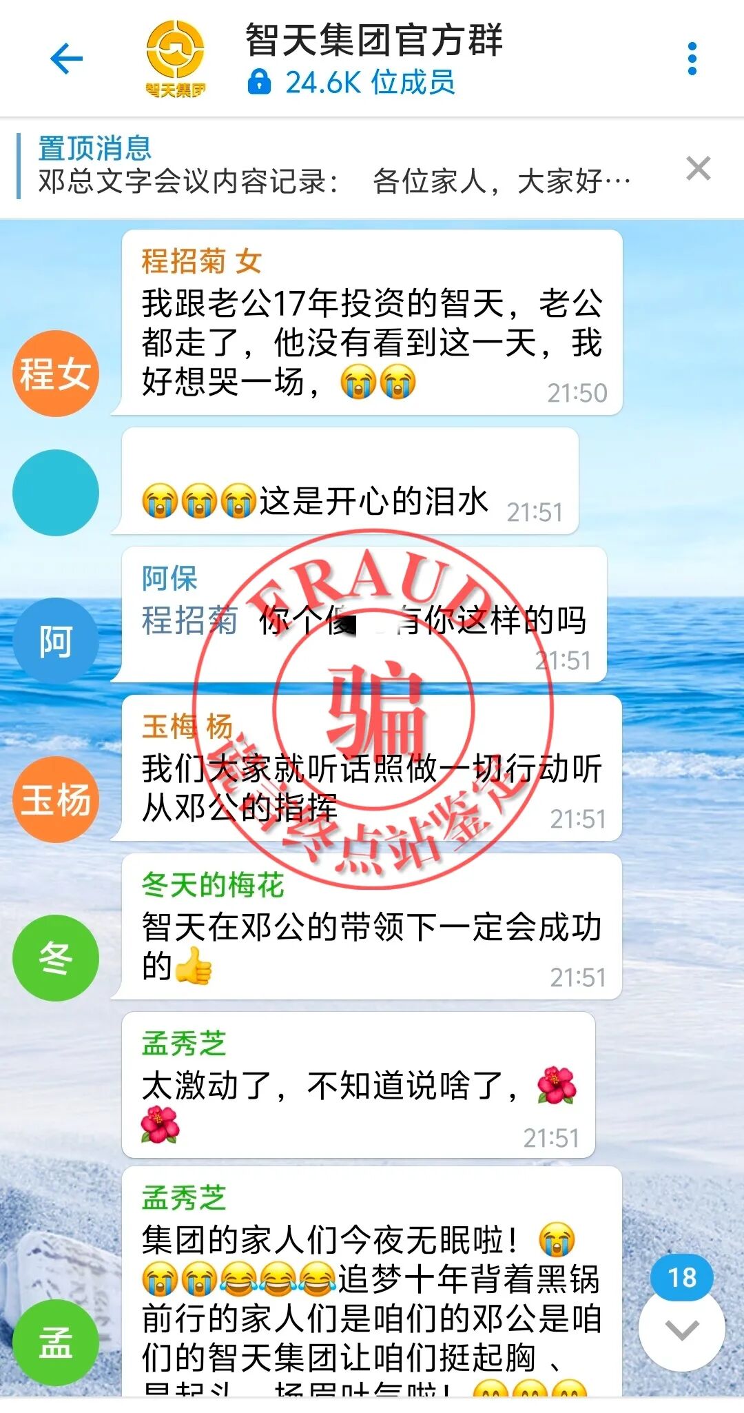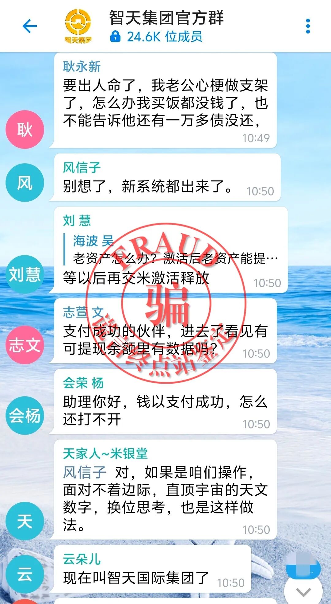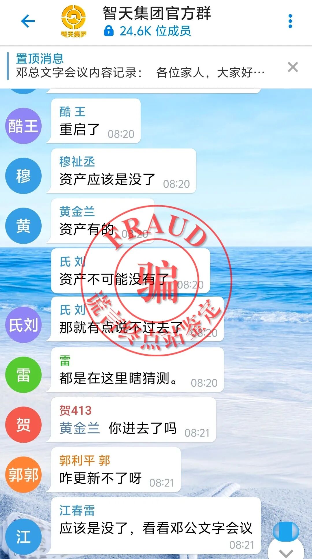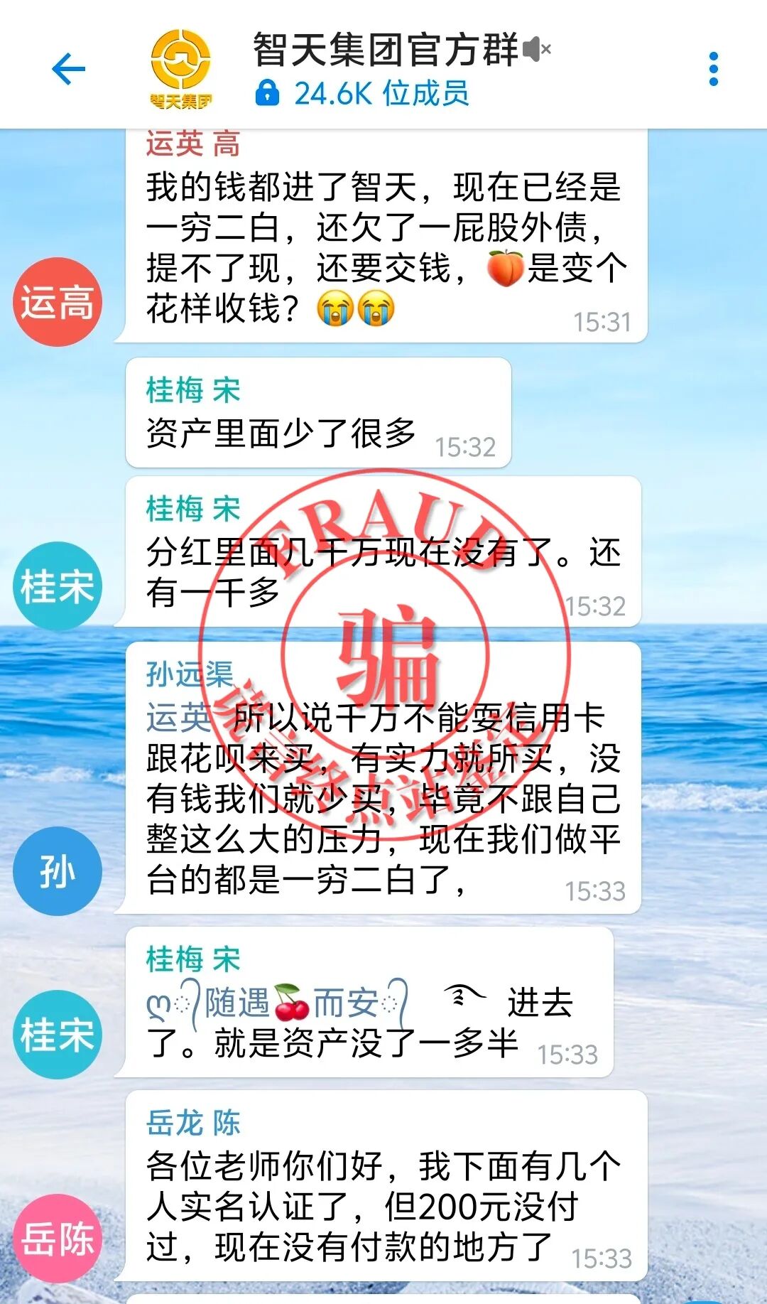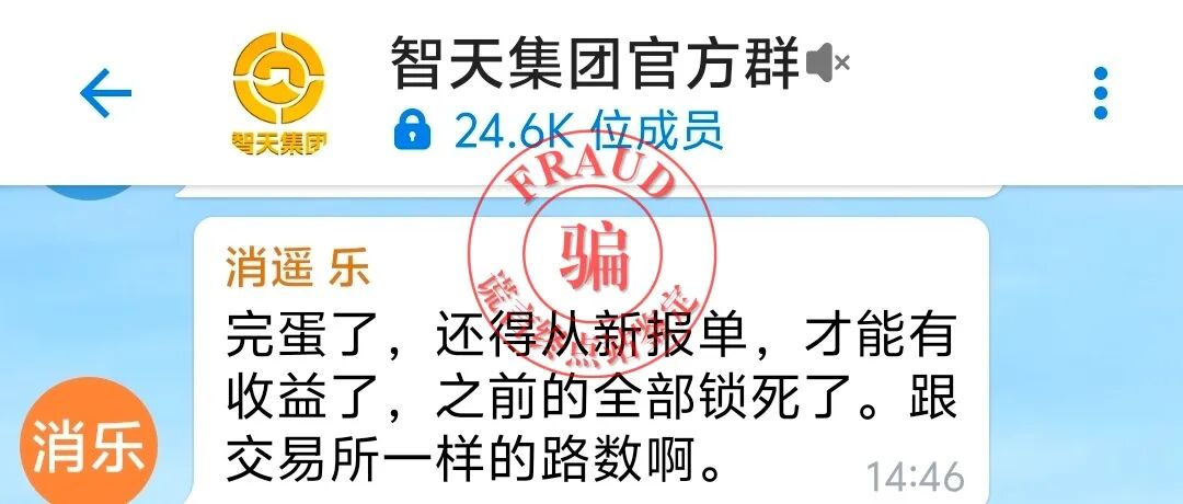 2025年11月15日,在一轮又一轮的超高收益、超短期产品的疯狂推销后,天家人们看着后台数字暴涨,等着发财之际,智天集团突然停止提现!来了一出关门打狗的好戏!这完全应验了谎言终点站的预测!