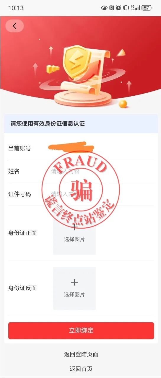 除了再一次开盘骗钱外,让通过上传身份证等收集个人资料,用于后续诈骗: