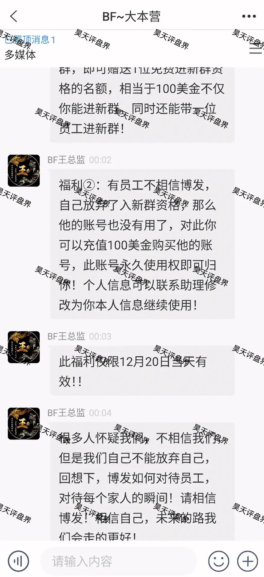 都崩盘那么长时间了,说好的18号结束缴费,今天都21号了竟然还在骗大家,让大家继续缴费,希望王总监能良心发现直接跑路吧,目前不少团队长被抓,真是害苦了这波团队长…