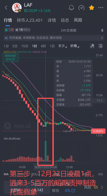 第一步:低价吸筹,掌握定价权。大团队起盘之初,用极低的价格在二级市场持有了大量LAF筹码,在一级市场拉人头质押LP,这时候市场上流通的LAF币减少,币价持续拉升。