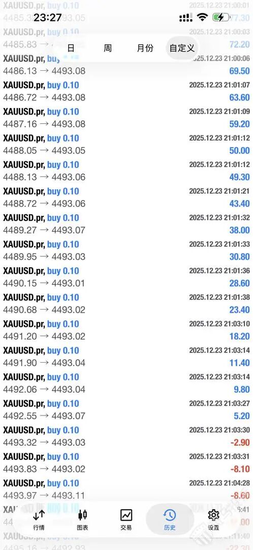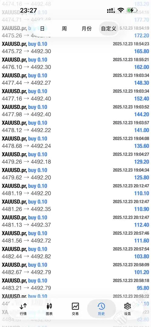 对此,A某解释称,其订单大部分持仓时间在10分钟以上,且多为0.1手的小单,平仓时使用了“一键平仓”功能,因此产生了密集的平仓记录。A某展示的交易策略是:黄金每涨0.1美元加仓一次,导致一个账户出现多个小单子。