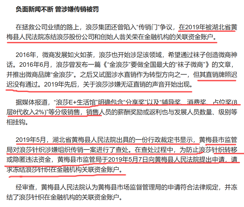 不卖关子了,今天小诺就来说一说“浪莎浪仕威”这个品牌。很多网友可能一看到“浪莎”两个字都会感到很熟悉。不错就是大家耳熟能详的那个国民丝袜品牌。浪仕威是浪莎旗下的一个子品牌,归属于“浪莎针织有限公司”。但是根据小诺在该品牌推广人员那里掌握的消息公司的收款账户主体为“浙江汾宝家居用品有限公司”。通过天眼查并未查出该公司与浪仕威品牌有任何关联。但是有位知情人向小诺透露,浪莎在2019年的时候因为产品销售模式存在传销行为被湖北一地市监局处罚。所以浪莎在做其他品牌的时候就开始规避主体公司。这个浪莎浪仕威的收款公司“浙江汾宝家居用品有限公司”就是为了规避风险创建起来的。