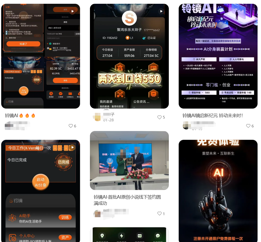 老铁们,今天咱不聊搬砖,专拆一个打着“AI”旗号的坑人玩意儿——铃镜AI。有粉丝私信发来截图,说朋友圈有人拉他入伙,看着像资金盘,让我给掌掌眼。我一看这截图,心就凉了半截,这哪是“AI风口”,分明是割韭菜的镰刀!今天必须把这事儿掰开了揉碎了讲讲,给大伙提个醒。