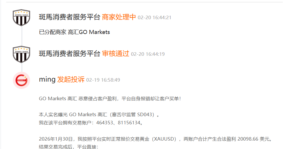 A某表示,2026年1月30日,我按照平台实时正常报价交易黄金(XAUUSD),两账户合计产生合法盈利 20098.66 美元。