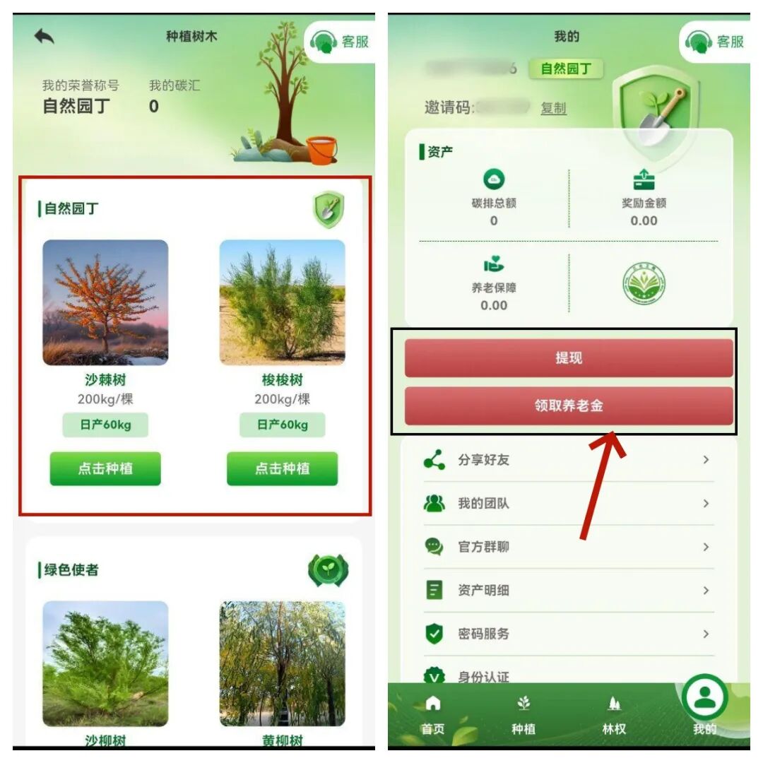 进入“三北工程”APP中,需要提交自己的信息,还要上传身份证正反两面,才能“种树”,种树有各种好处,拉人来注册“三北工程”APP,还能获得“林权”及“林权收益”,最奇葩的是在这“三北工程”APP中居然还有“领取养老金”?